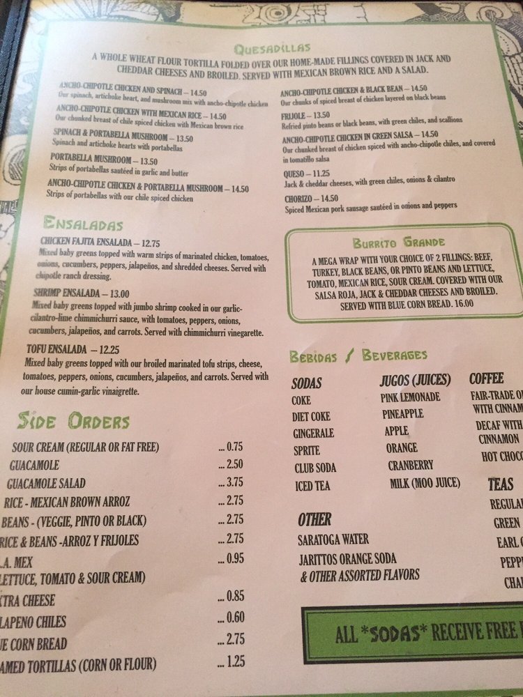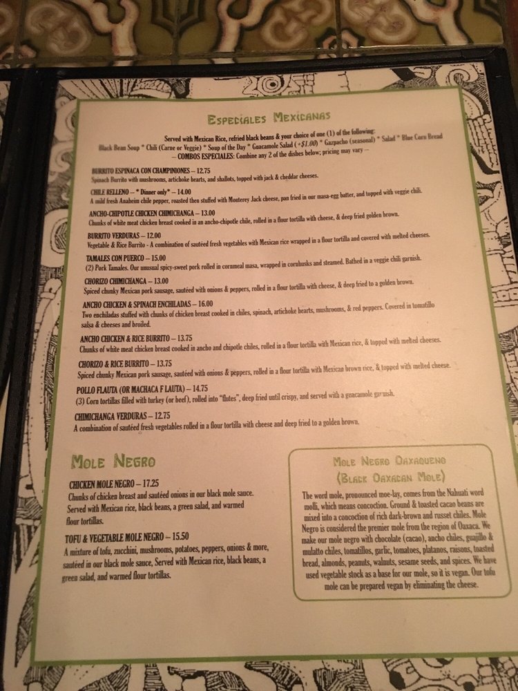 A mixture of tofu, zucchini, mushrooms, potatoes, peppers, onions and more, sauteed in our black mole sauce, Served with Mexican rice, black beans, a green salad and warmed flour tortillas.